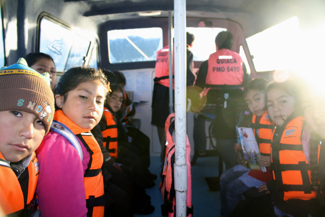 Es un lunes soleado de fines de marzo. El mar apenas se mueve en el Puerto de Caleta Pichicolo. Cerca de las 8 de la mañana esta tranquilidad se interrumpe con la llegada de la lancha Quiaca, un bus escolar acuático que transporta a los niños de las cercanías a la Escuela Rural Candelaria de la isla de Llanchid. Su capitán, Luis Torres, amarra la lancha al puerto mientras espera la llegada de su tripulante y del profesor Luis Maldonado.